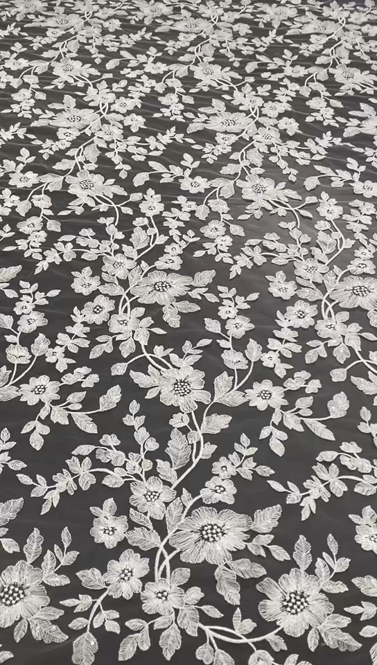 • Exquisite beaded fabric with crystal beads, sparkling sequins, and embroidered flowers for wedding dresses, bridal dresses, bridal veils, and party dresses.
