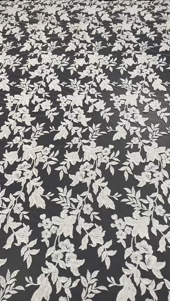 Exquisite beaded fabric with litter sparkling sequins, and embroidered flowers for wedding dresses, bridal dresses, bridal veils, and party dresses.