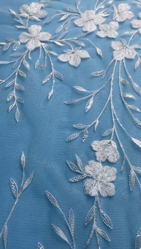 Exquisite beaded fabric with crystal beads, sparkling sequins, and embroidered flowers for wedding dresses, bridal dresses, bridal veils, and party dresses.